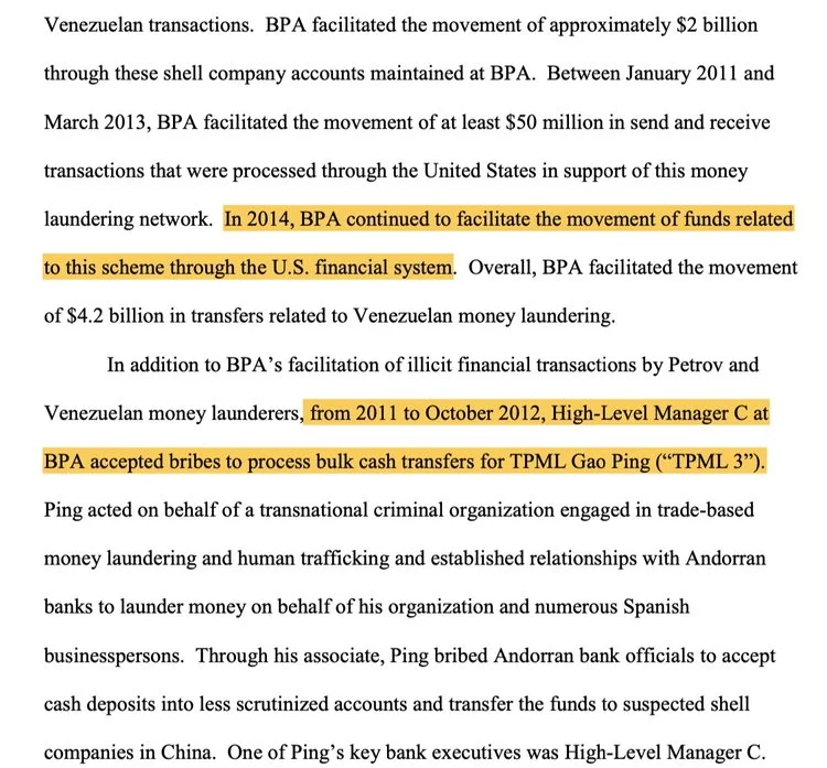 FinCEN also accused BPA of assisting Chinese businessman Gao Ping through his associate, Spanish national Rafael Pallardó, between 2008 and 2011. However, in 2011, BPA, operating under the regulations of banks in Spain, dropped Pallardó as a client due to his activities, which could be classified as tax evasion—a crime in Spain, though not in Andorra.
